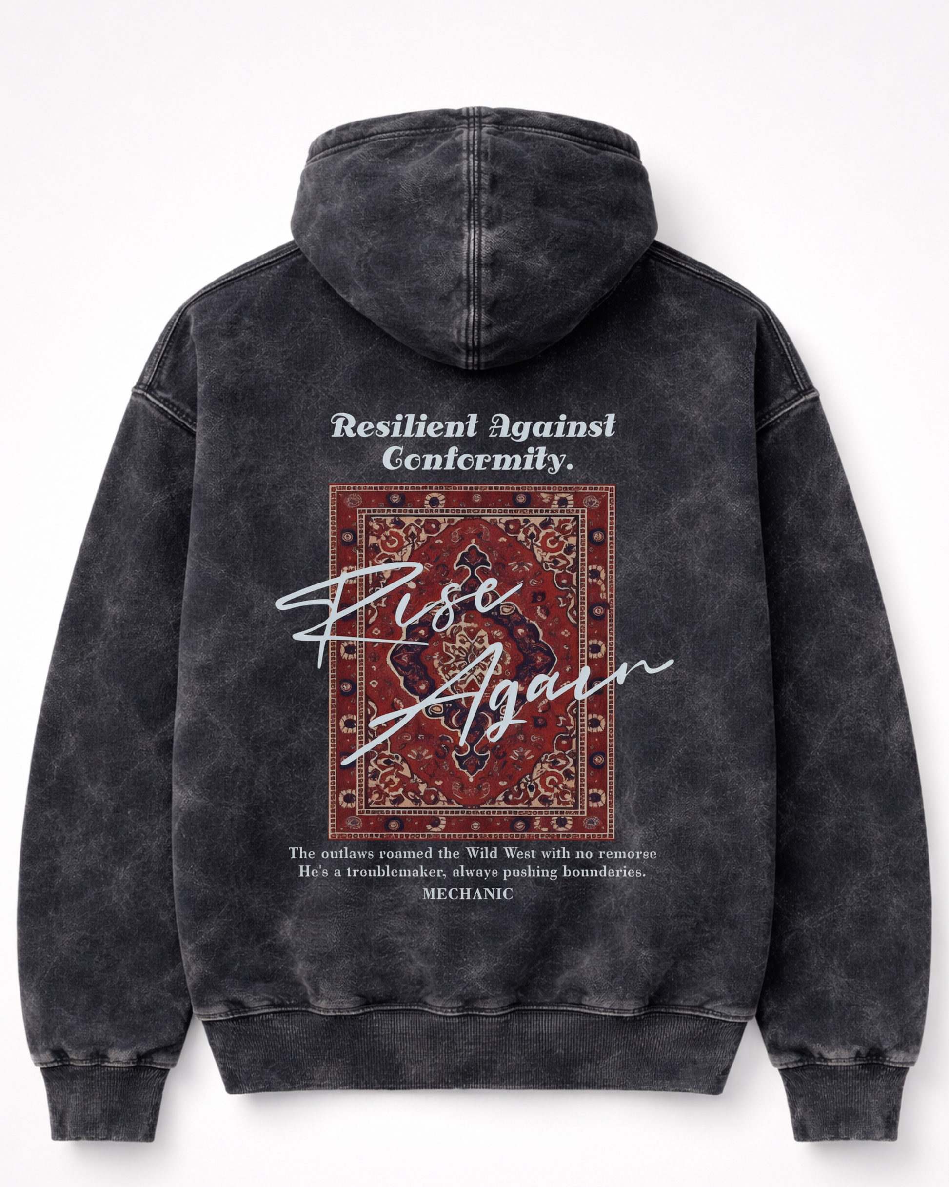 Make a statement of defiance and endurance with the "Rise Again" Hoodie. Featuring a heavy charcoal acid-wash finish, this piece blends high-quality craftsmanship with a bold, rebellious spirit. The design juxtaposes traditional Persian rug aesthetics with outlaw-themed typography to create a narrative of resilience.
